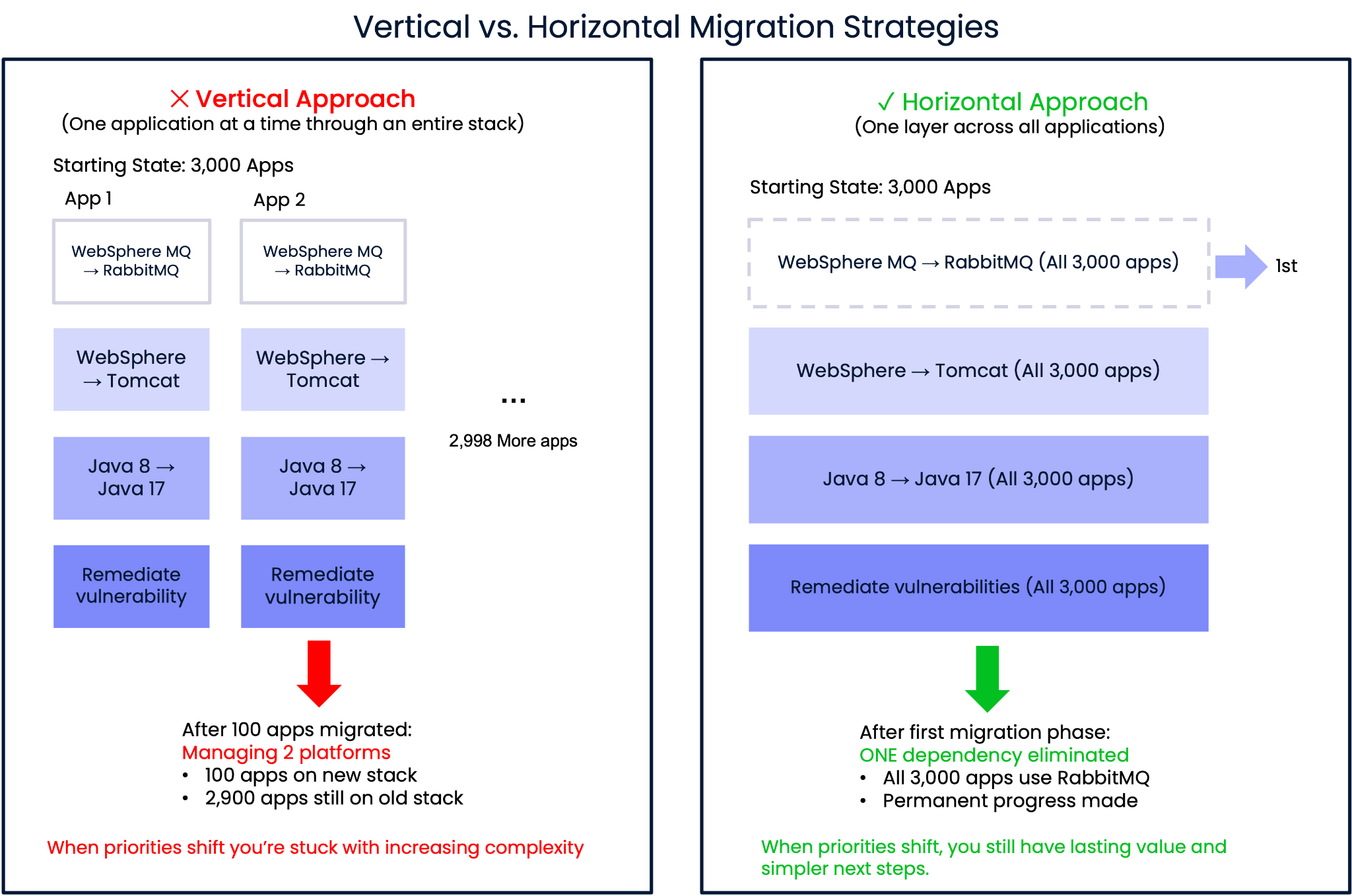 A traditional vertical approach would take applications through the entire stack one at a time. If business priorities shifted after 100 applications were completed, the organization would be left managing two platforms at once. By contrast, a horizontal approach eliminated WebSphere MQ across all 3,000 applications first. Even if priorities changed, the organization had still removed a major constraint from the system. When the issue inevitably resurfaced, there was one less dependency standing in the way.