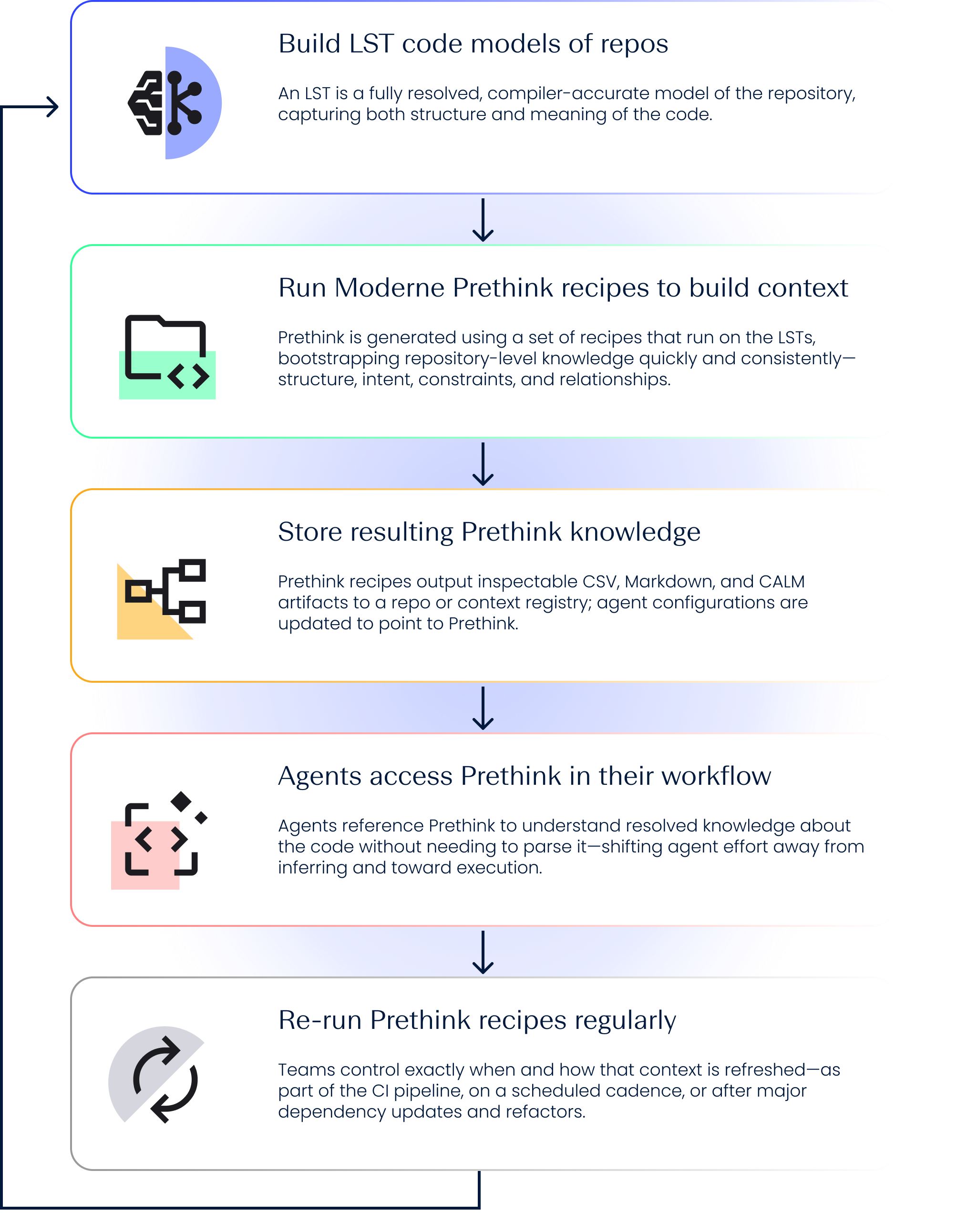 Moderne Prethink remakes “context” for coding agents. With Prethink, context is no longer a collection of prompts and snippets for assembling understanding—it’s resolved, semantic knowledge derived directly from the code. This knowledge is versioned like code, refreshed as code changes, and consulted by AI agents at development time.
