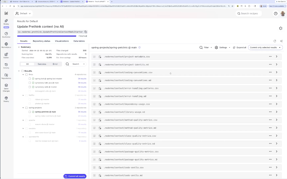 Moderne's lossless semantic tree (LST) is that resolved form. Symbols, types, method calls, dependency graphs, all already computed. Prethink is the recipe that takes the LST and turns it into a set of CSV and Markdown files that live next to the code, so an agent can query exactly the architectural information it needs without re-deriving it. The starter set covers service interfaces, test coverage, dependencies, coding conventions, and code quality. Language coverage today includes Java, JavaScript, TypeScript, and Python, with C# arriving soon.