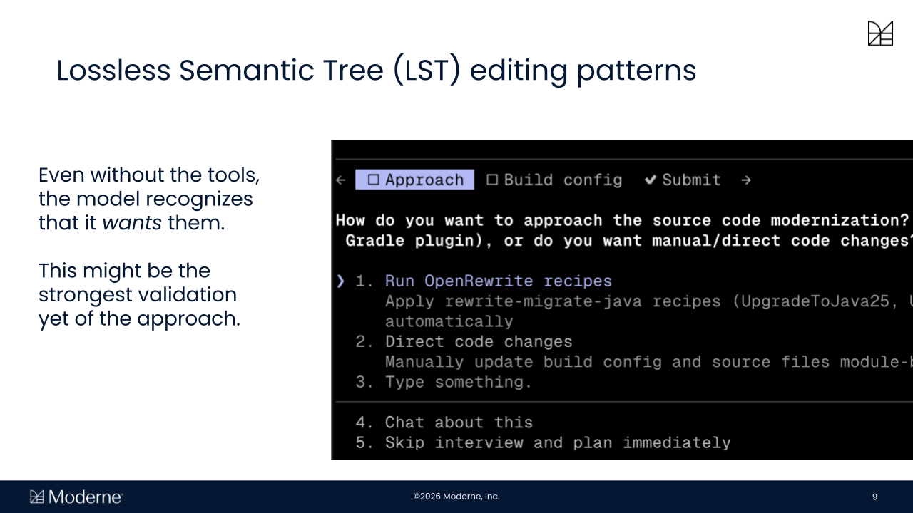 The question I keep coming back to is not how capable a given model is, but how much of the work it’s doing should have been handled by better tooling instead. At Moderne, that’s the question we’re building toward: not replacing coding agents, but making them viable at enterprise scale by providing the underlying operations they can rely on for search, context, transformation, and coordination, so that model-driven work is reserved for the parts of the problem that actually require it.
