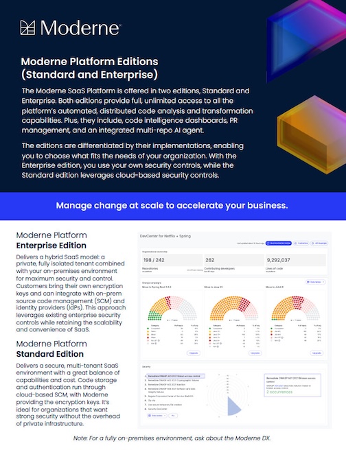 The Moderne SaaS Platform is offered in two editions, Standard and Enterprise. Both editions offer the same robust feature set, but are distinguished by their implementations. Read the product brief for more information about each edition and see a comparison of features and capabilities.