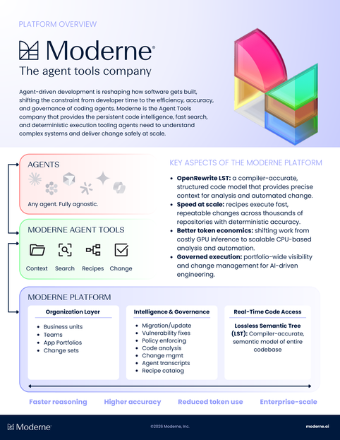 Moderne is the Agent Tools company providing the code intelligence, discovery, and deterministic automation coding agents and developers need to analyze, evolve, secure, modernize, and govern large software systems—from a single project to thousands of repositories at once.