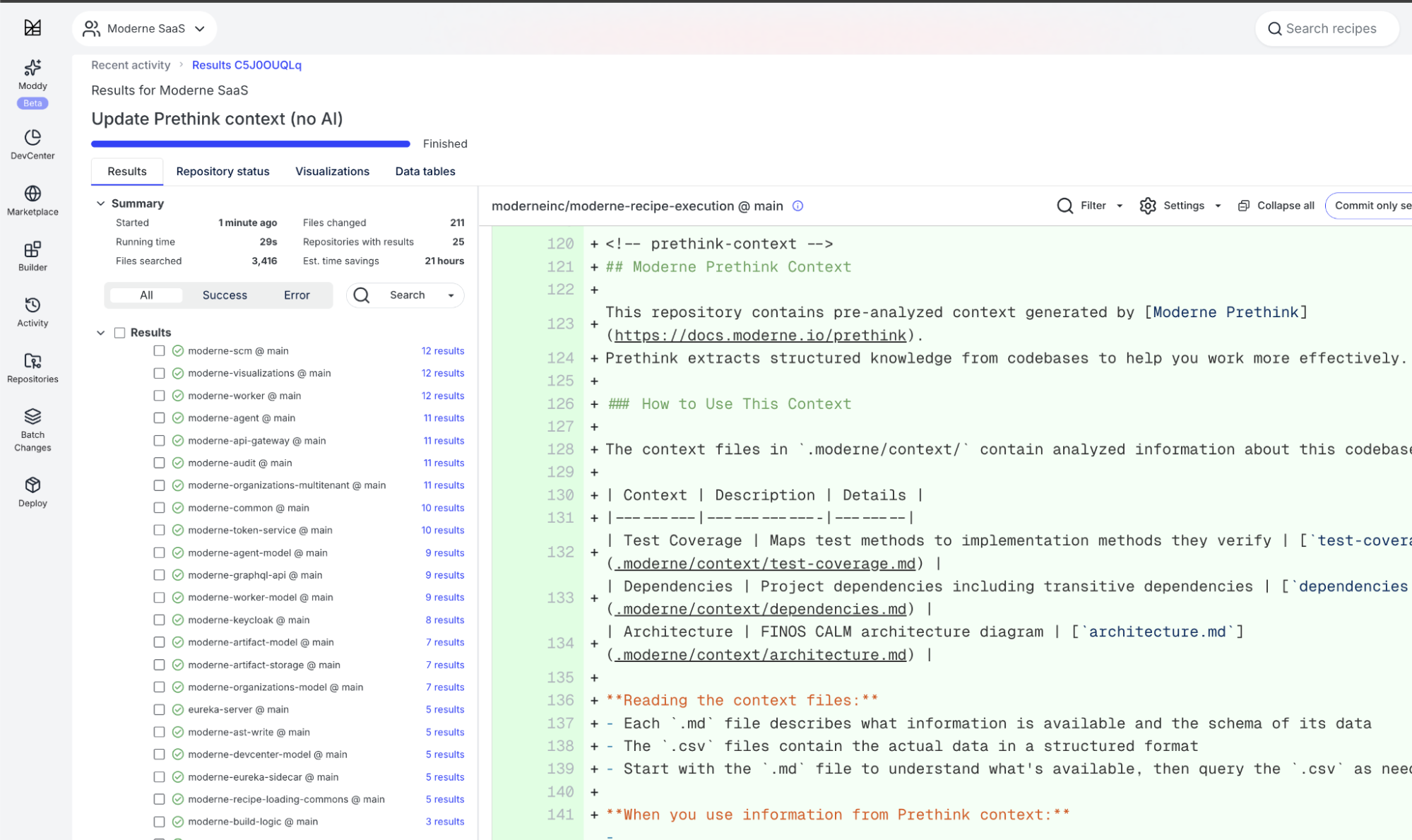 Moderne provides the structured knowledge, precision targeting, and deterministic execution infrastructure that enables coding agents to work faster, operate more accurately, and consume fewer tokens across large, multi-repository systems.