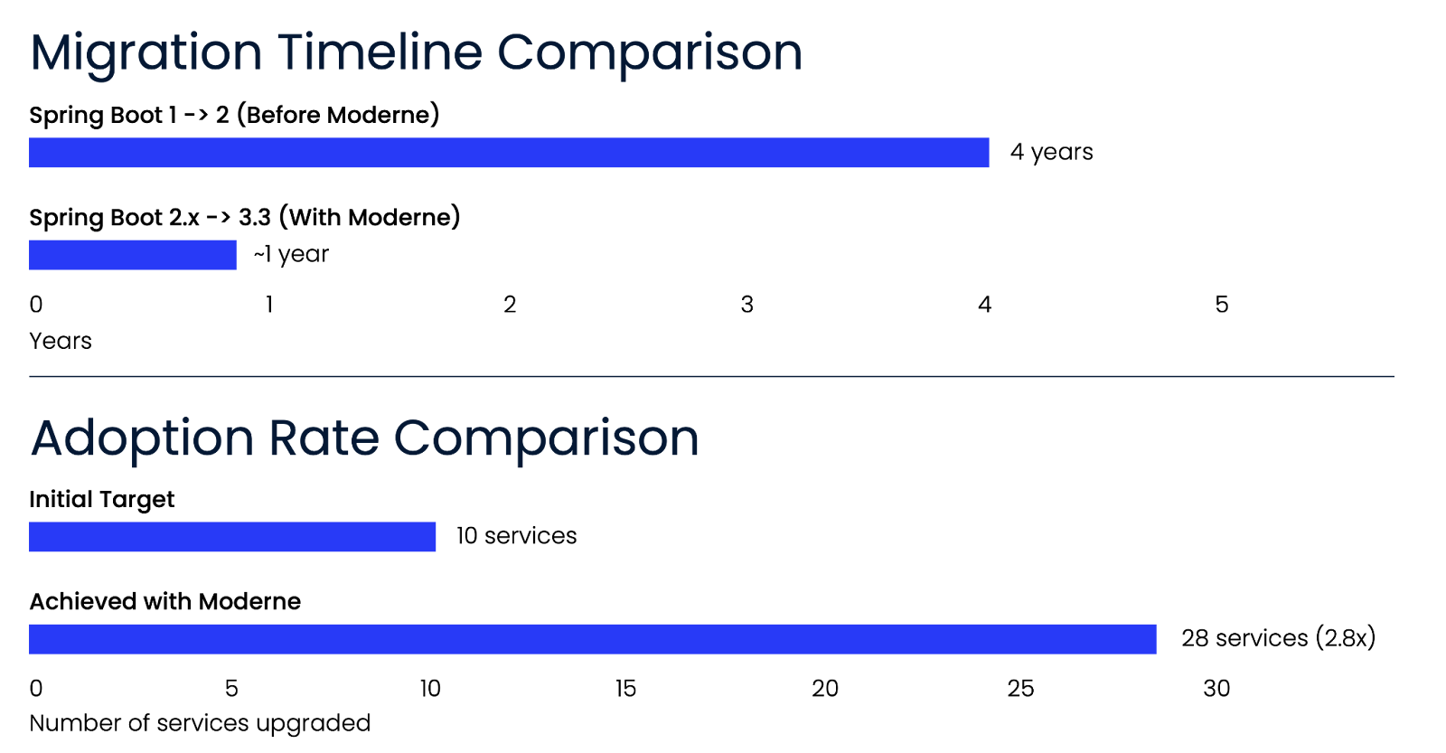 A concrete example is Squarespace, where automation helped accelerate modernization efforts significantly—reducing the time required to move to newer Spring Boot versions compared to earlier, manual upgrades.