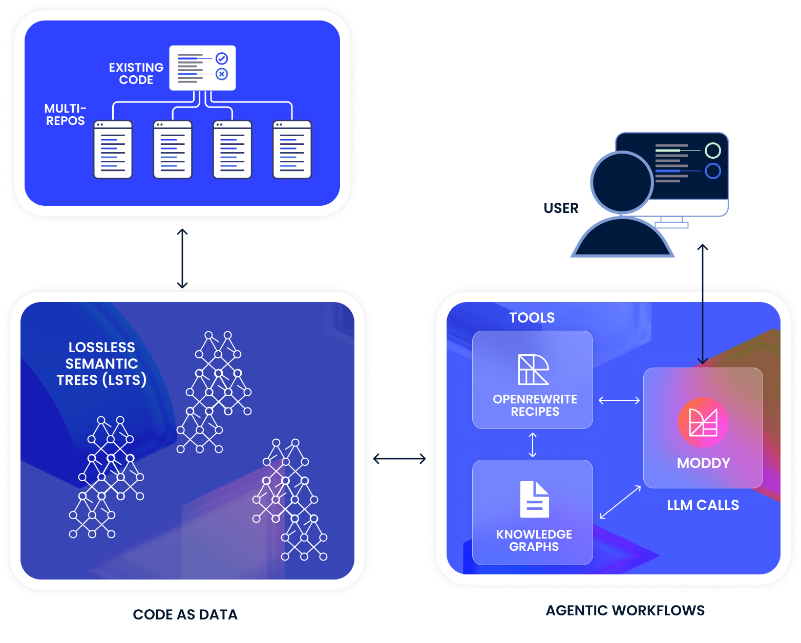 Moddy includes tool function calling, whereby the thousands of deterministic recipes in the OpenRewrite recipe marketplace serve as tools to provide LLMs vital context and direction. Developers work through Moddy's real-time agentic interface to effortlessly navigate, understand, and evolve even the largest, most complex codebases.